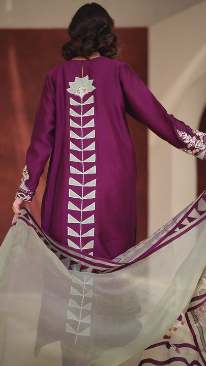 This beautifully crafted outfit features intricate floral embroidery on a rich maroon silk base, creating a regal and festive look. The straight-cut shirt is detailed with delicate threadwork on the neckline, sleeves, and hemline, making it an ideal choice for Eid, wedding events, festive dinners, and formal occasions.