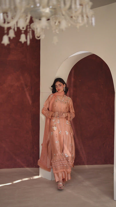 Make a graceful statement with this peach embroidered 3 piece suit, designed for women who appreciate refined elegance and modern sophistication. Crafted in a luxurious sheesha silk fabric with a subtle sheen, this outfit features delicate floral embellishments and intricate thread detailing that enhance its timeless appeal.