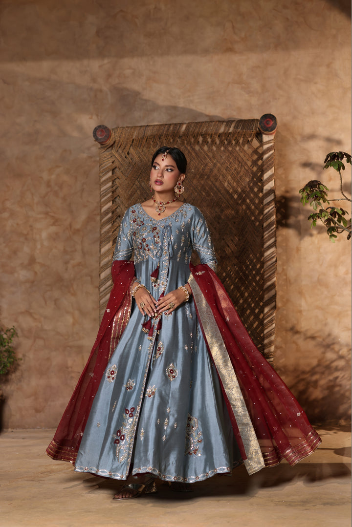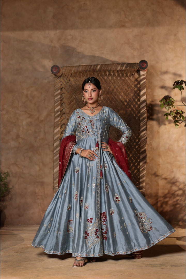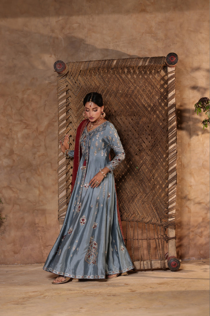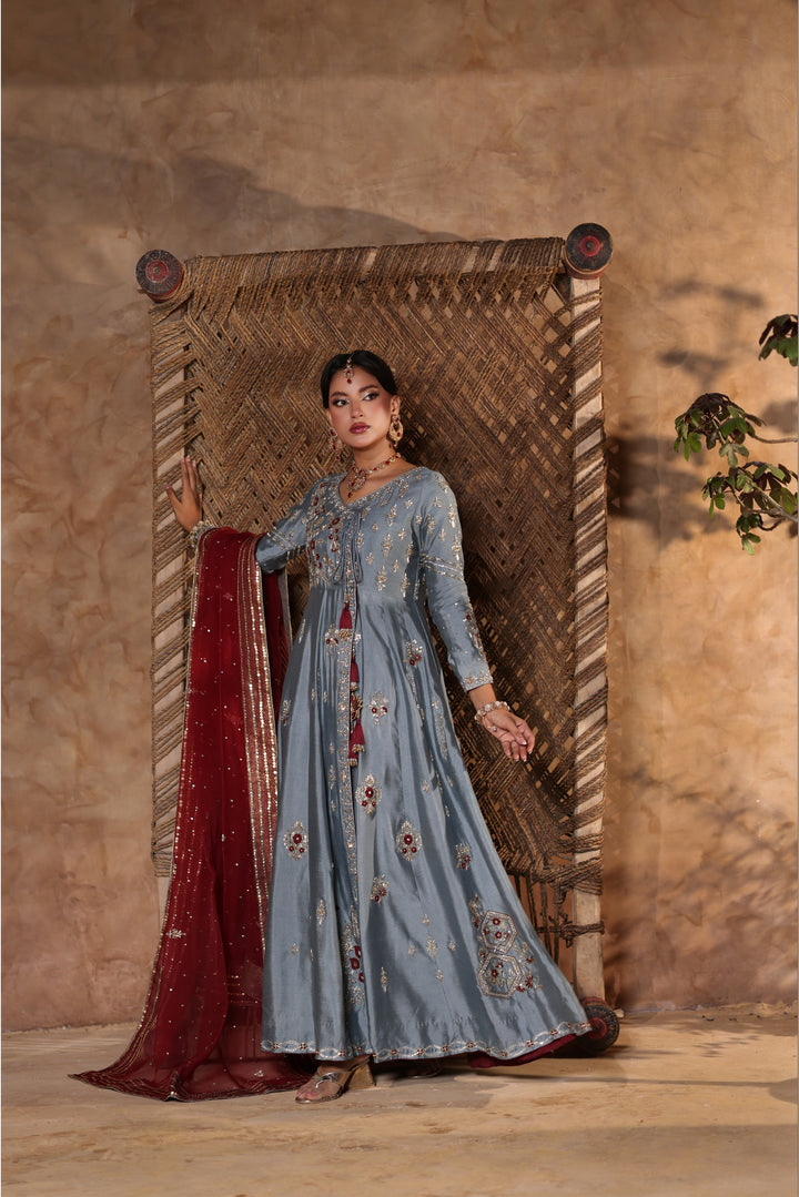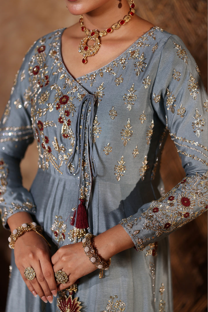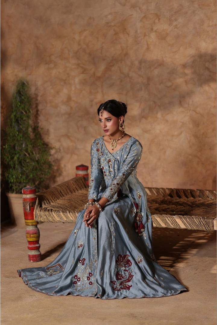 Gray Kalidar Sheesha Silk Peshwas: The pairing of gray sheesha silk with maroon resham and appliqué creates a sophisticated aesthetic. The heavily embellished bodice elevates the look with glamour and richness.