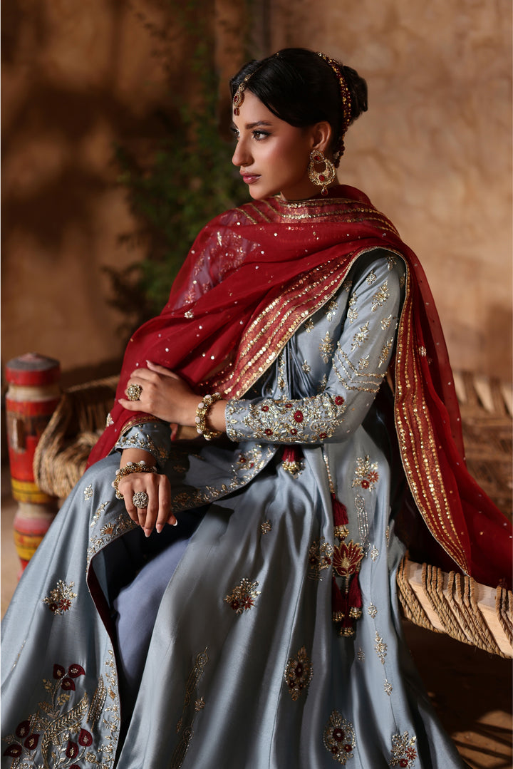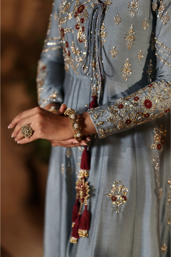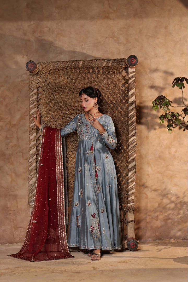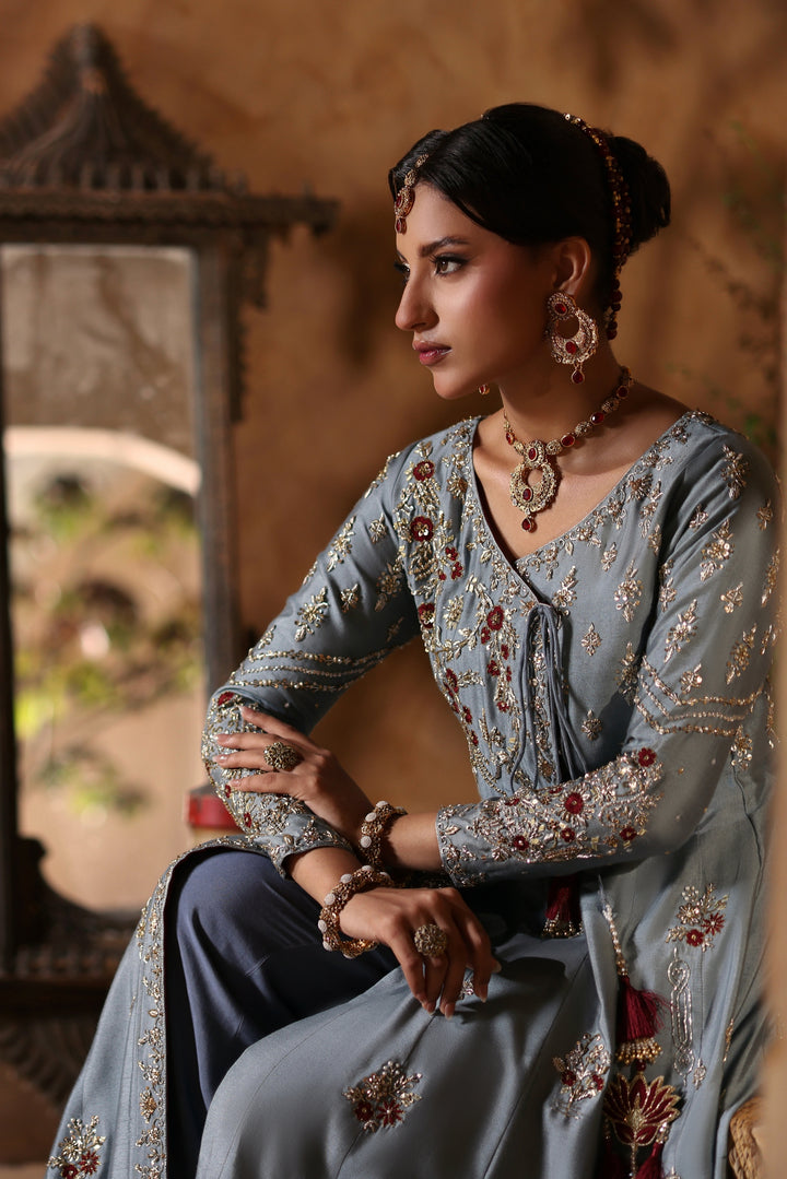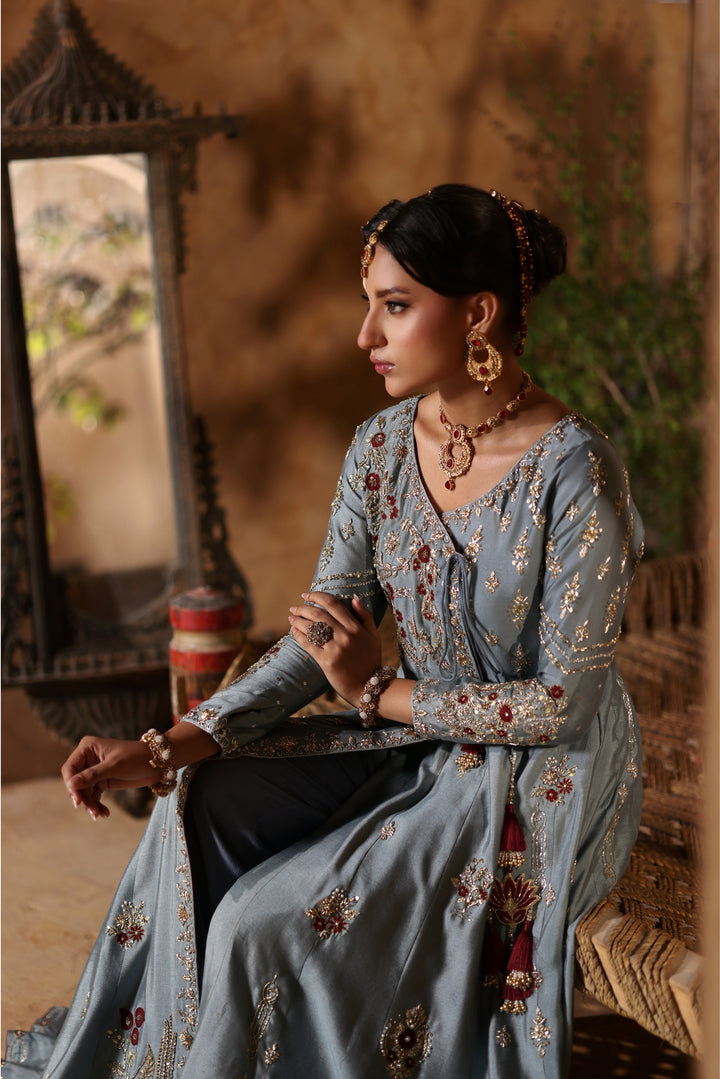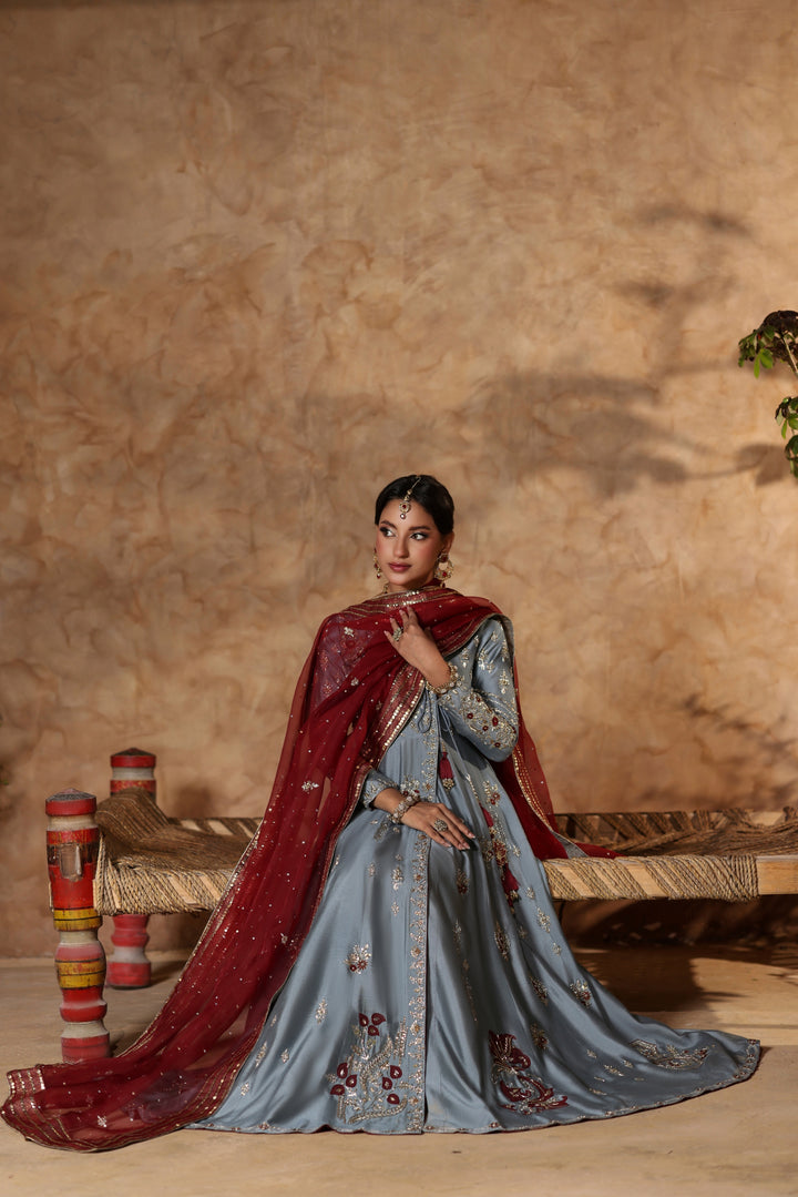 Gray Kalidar Sheesha Silk Peshwas: The pairing of gray sheesha silk with maroon resham and appliqué creates a sophisticated aesthetic. The heavily embellished bodice elevates the look with glamour and richness.