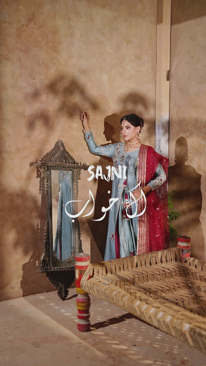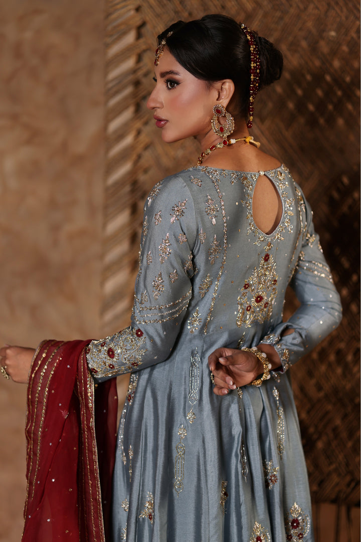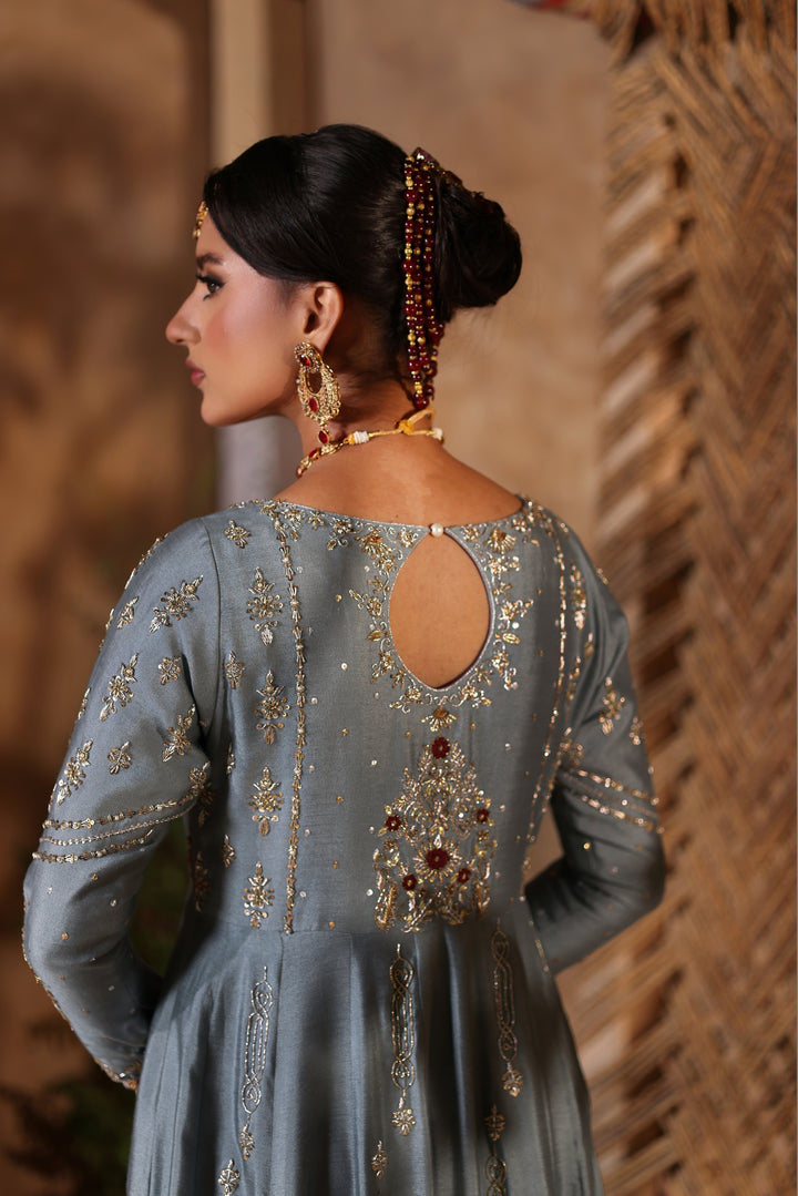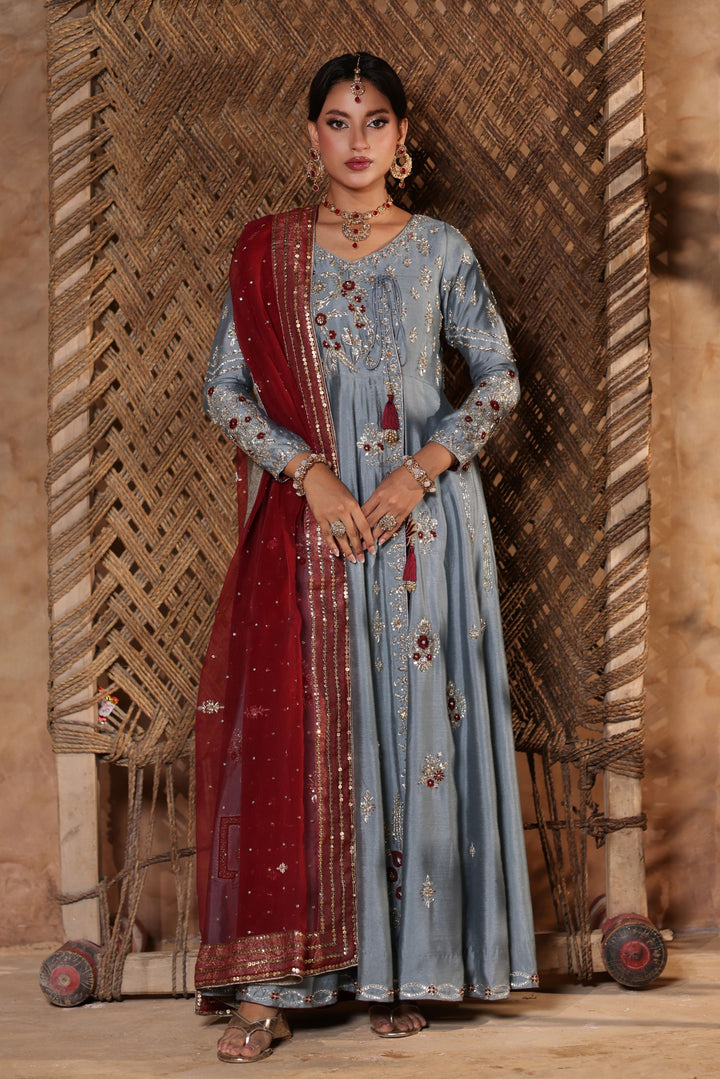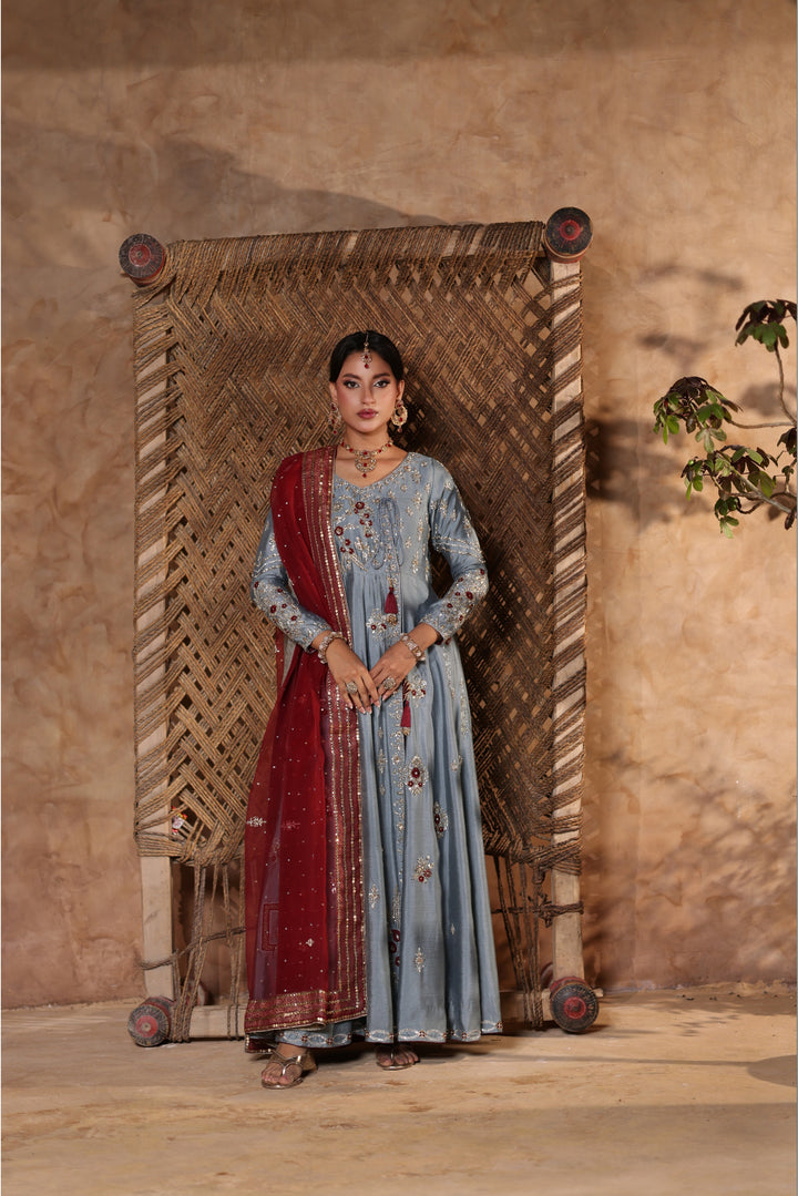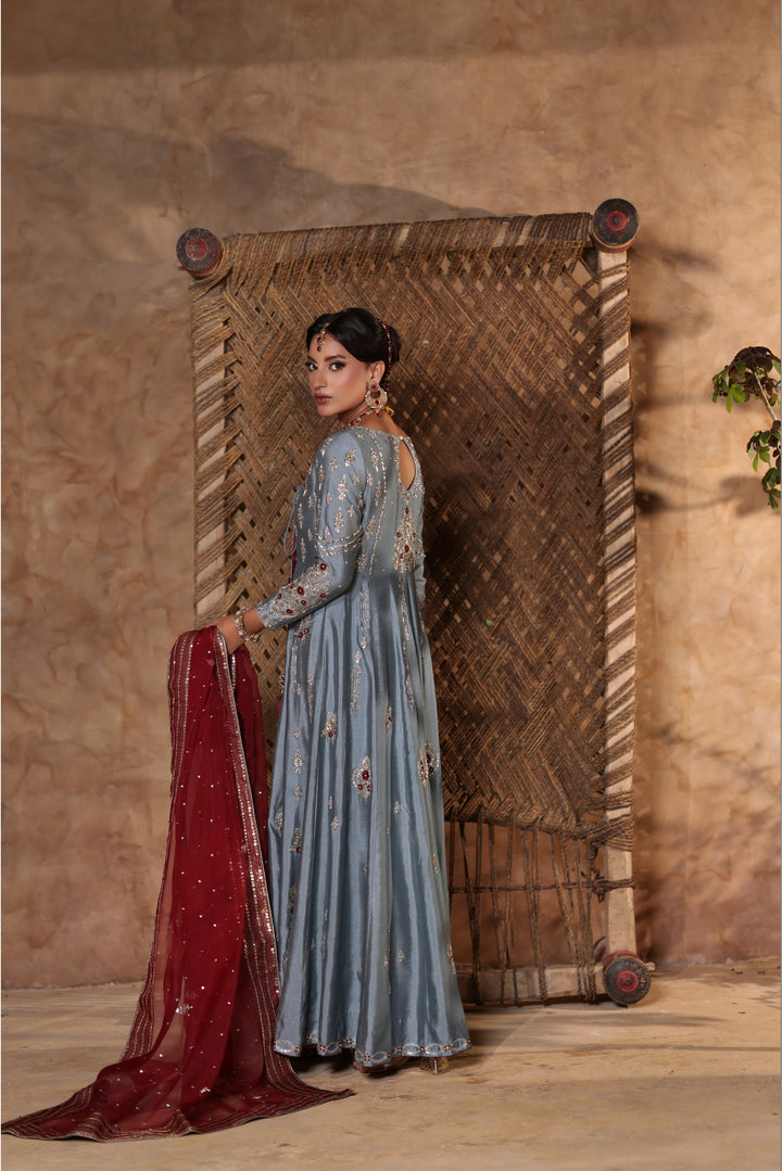 Gray Kalidar Sheesha Silk Peshwas: The pairing of gray sheesha silk with maroon resham and appliqué creates a sophisticated aesthetic. The heavily embellished bodice elevates the look with glamour and richness.