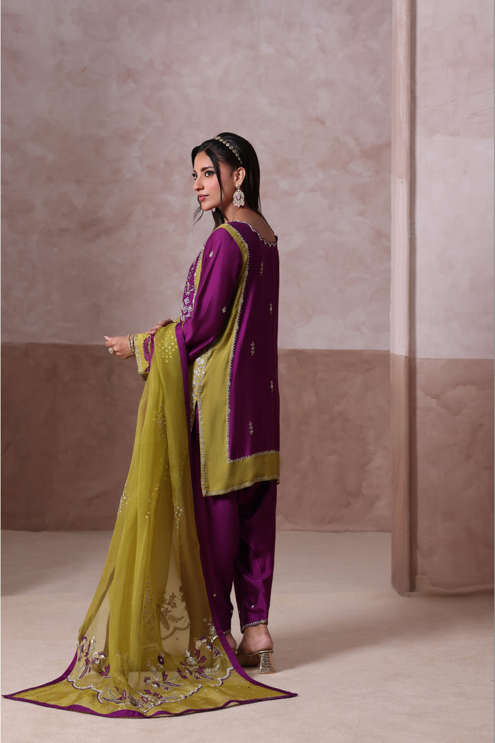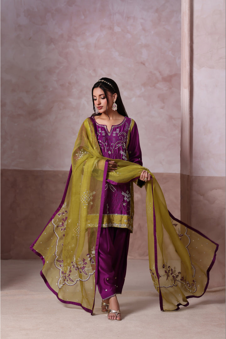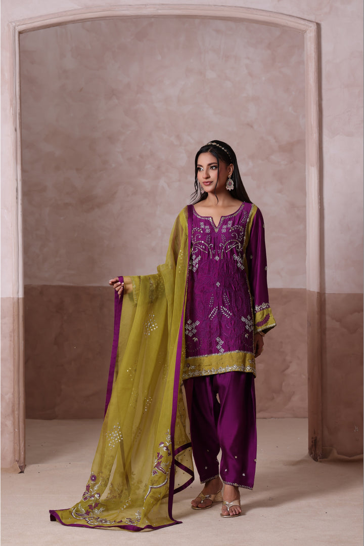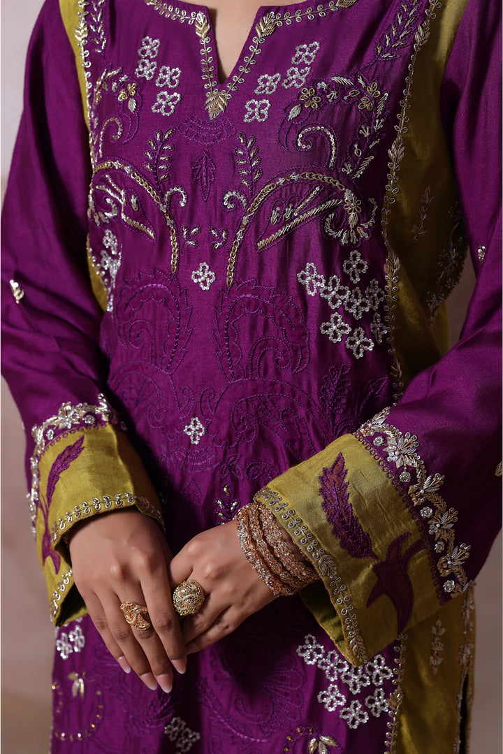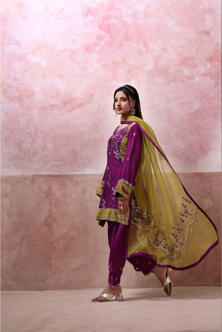 Top: Magenta sheesha silk short shirt with self appliqué and lime green panels. Features zardozi and reham work with gold, silver, kora, and dabka.