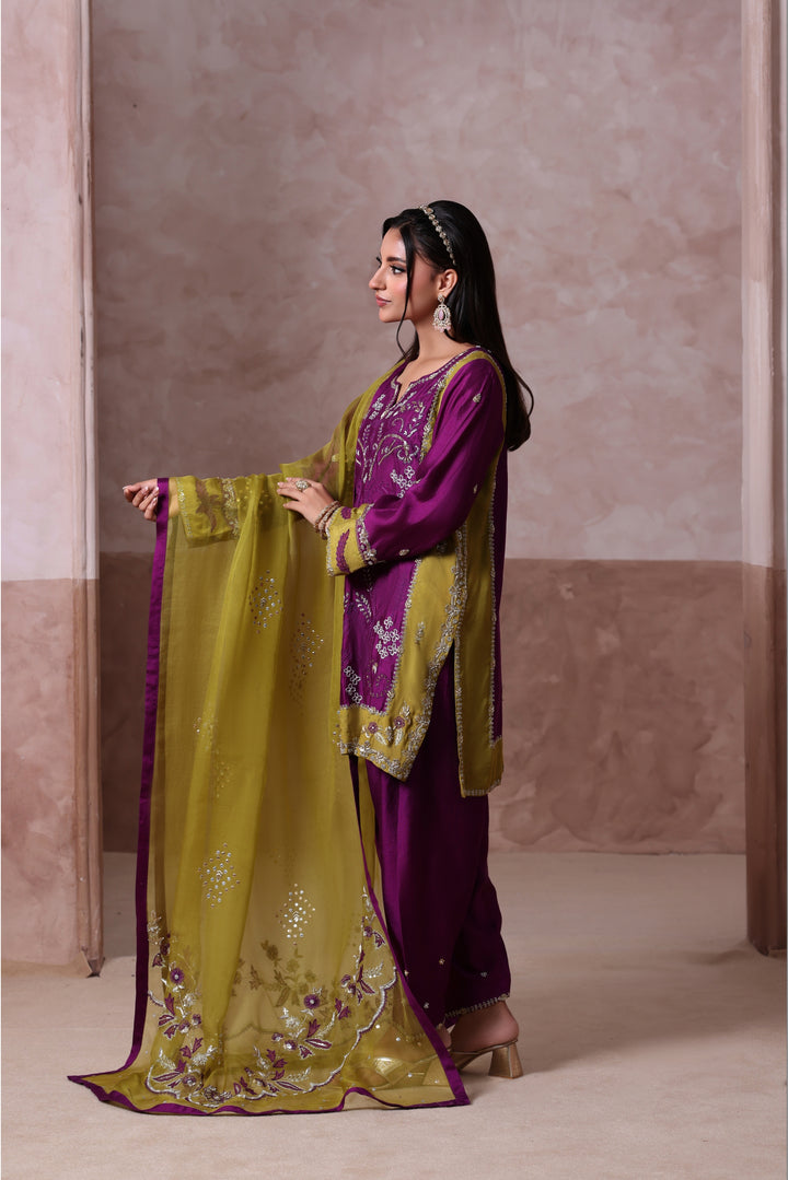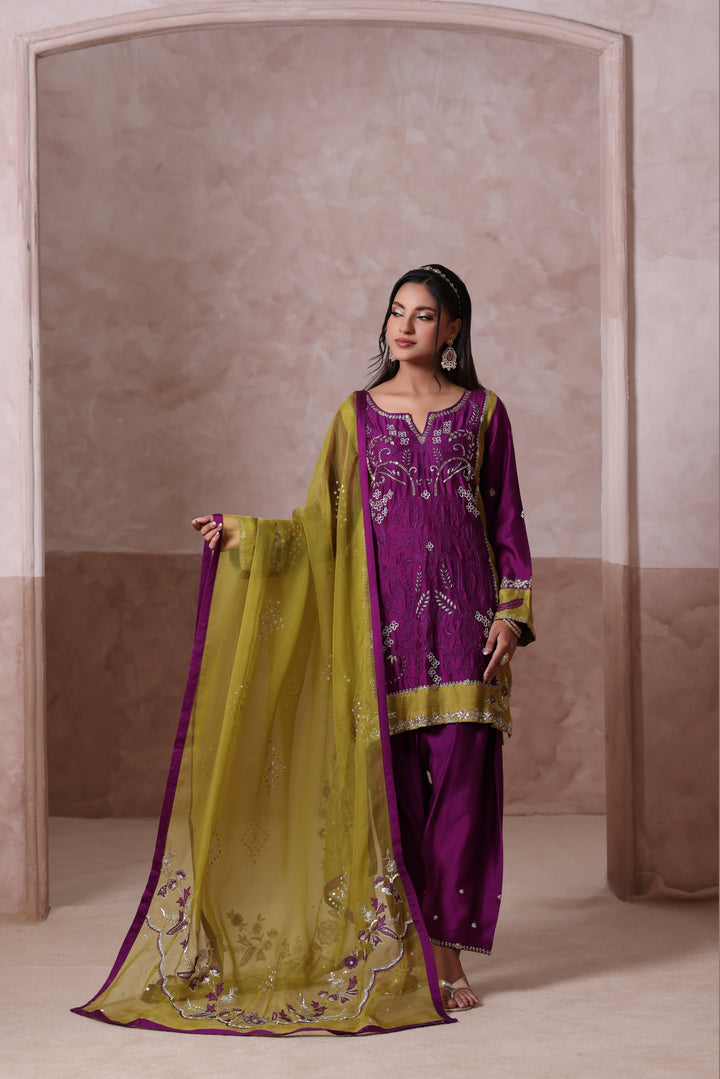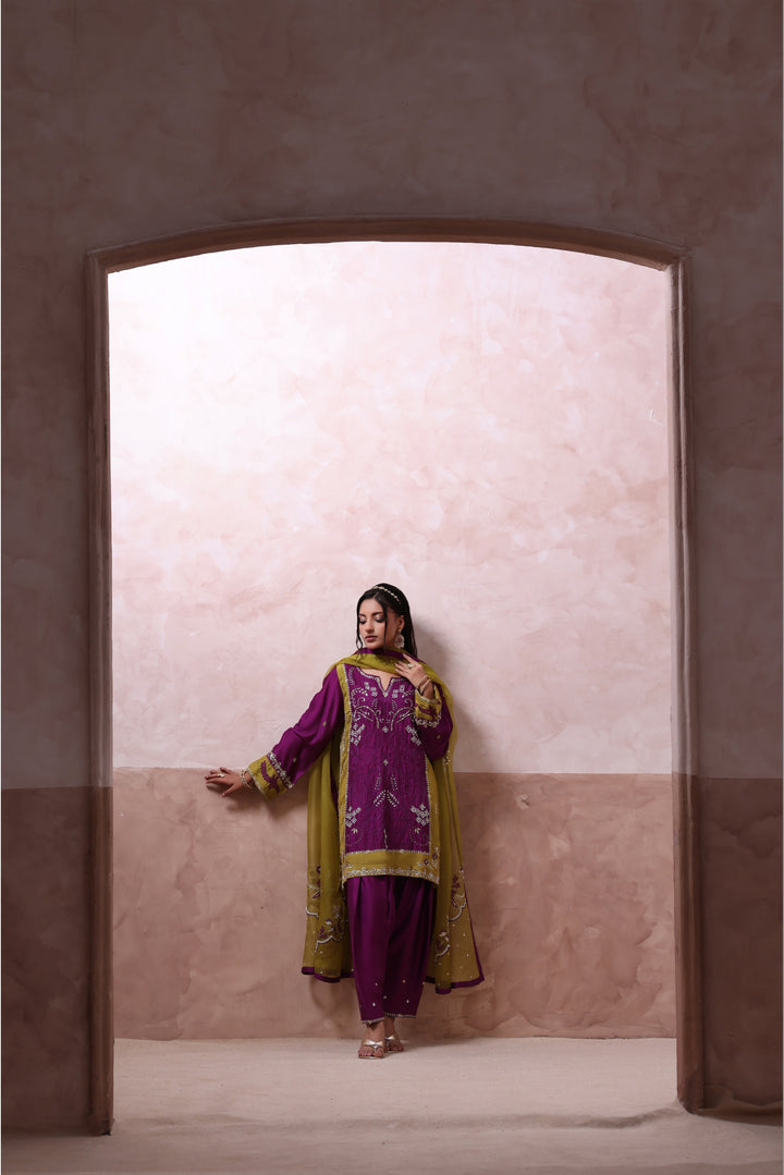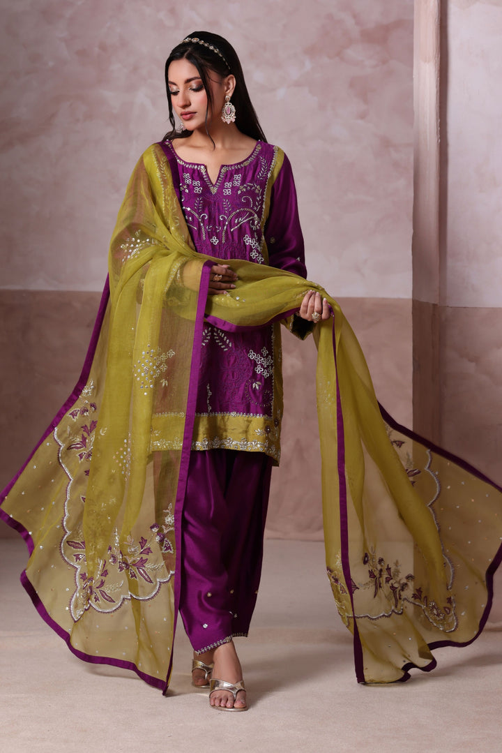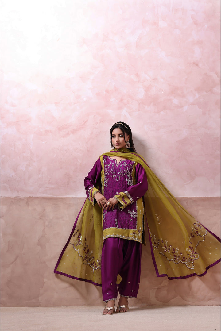 Top: Magenta sheesha silk short shirt with self appliqué and lime green panels. Features zardozi and reham work with gold, silver, kora, and dabka.