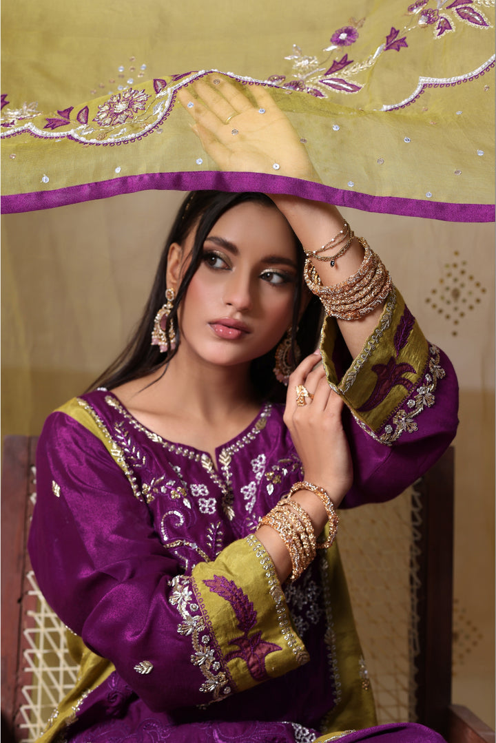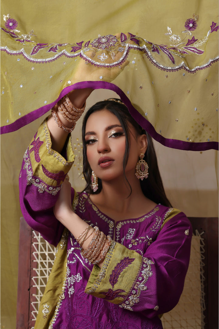 Magenta Sheesha Silk Top: The blend of magenta sheesha silk with lime green panels creates a bold and striking look. Sheesha silk’s natural shine enhances elegance.