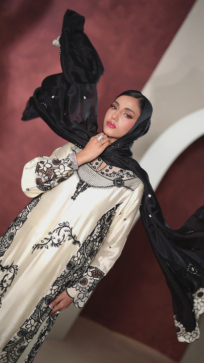 Step into elegance with this luxury black and ivory embroidered 3 piece suit, crafted from Sheesha silk blend fabric for a rich and graceful fall. The shirt features intricate black thread embroidery with detailed borders and statement neckline work, creating a timeless formal look.
