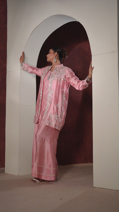 Make a graceful statement with our Blush Pink Embroidered Silk jacket, a perfect blend of timeless elegance and modern sophistication. Designed in a soft peach pink shade, this luxury formal outfit features intricate zari and thread embroidery that enhances its festive charm.