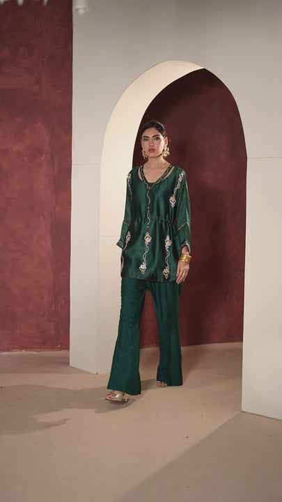 Make a bold yet elegant statement with our Emerald Green Embroidered Silk Suit, a sophisticated ensemble designed for women who love timeless charm with a modern touch. Crafted in a rich emerald green shade, this outfit features delicate gold stone work that enhances its luxurious appeal.