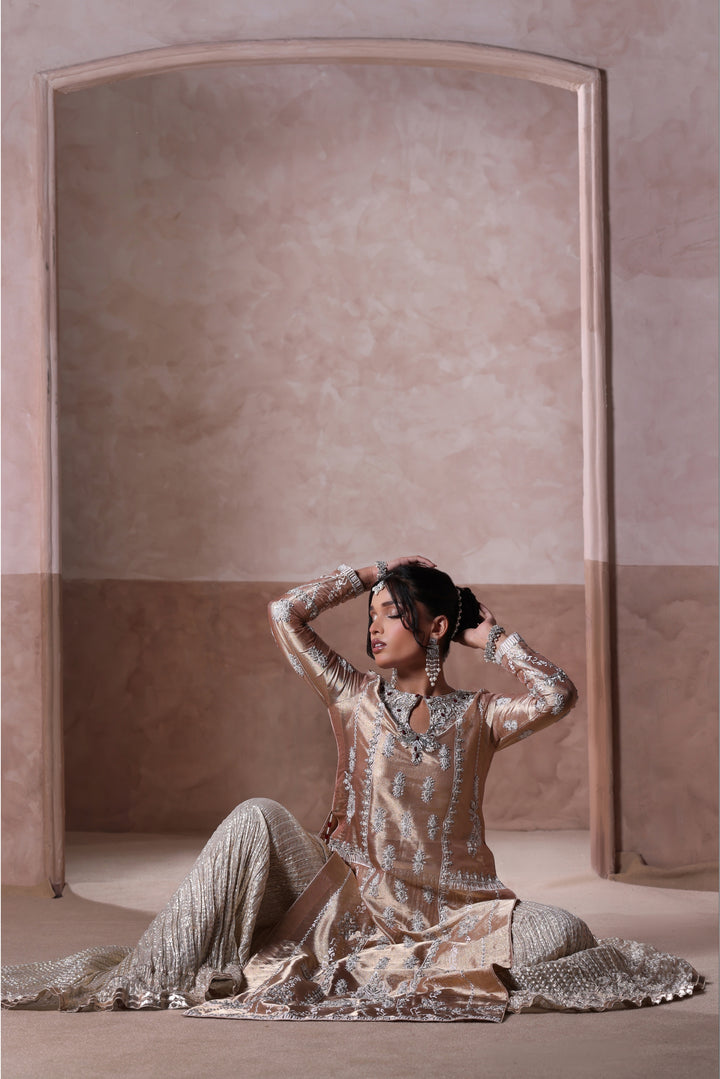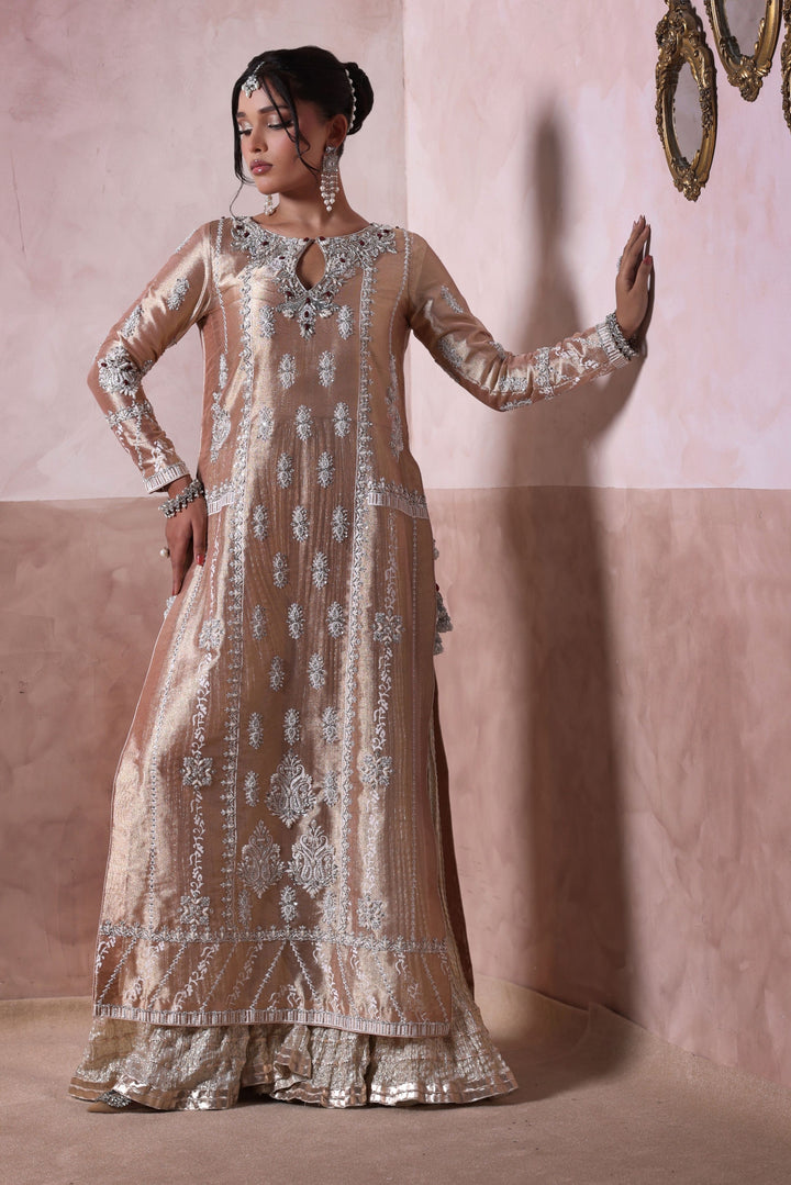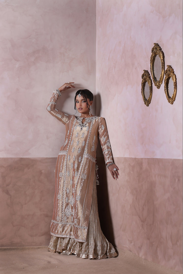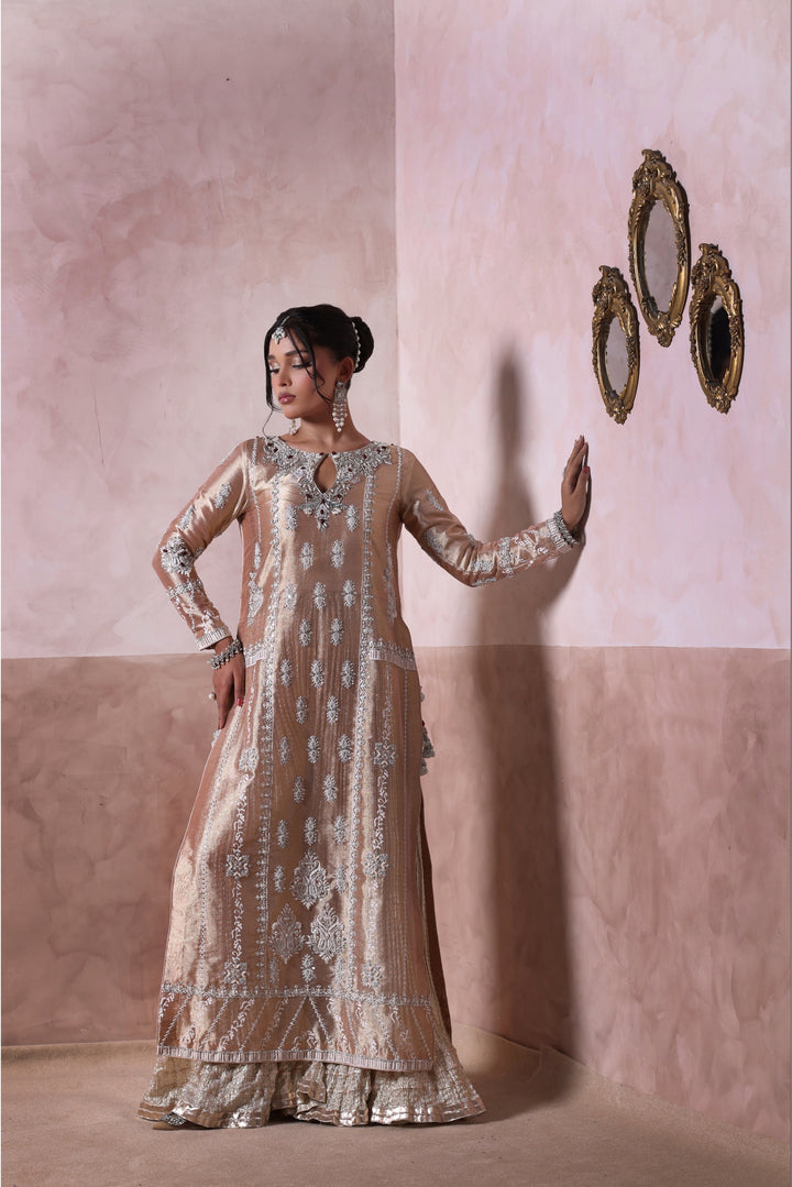 Top: Lambha tissue with block print, diamante, and pearl work all over.